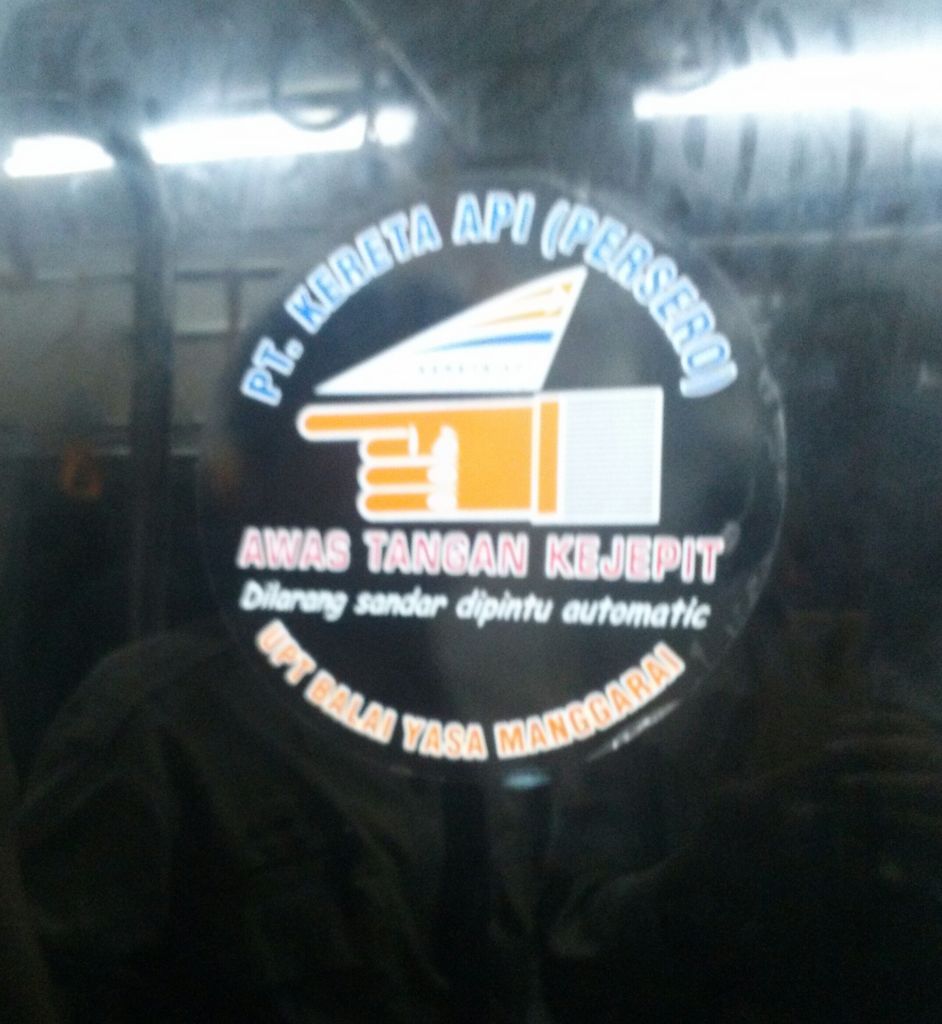 Setiap kali naik kereta Commuter Line, saya selalu keki membaca stiker yang tertempel di setiap pintu kereta. "Awas tangan kejepit Dilarang sandar dipintu automatic". Kacau benar bahasa Indonesianya....