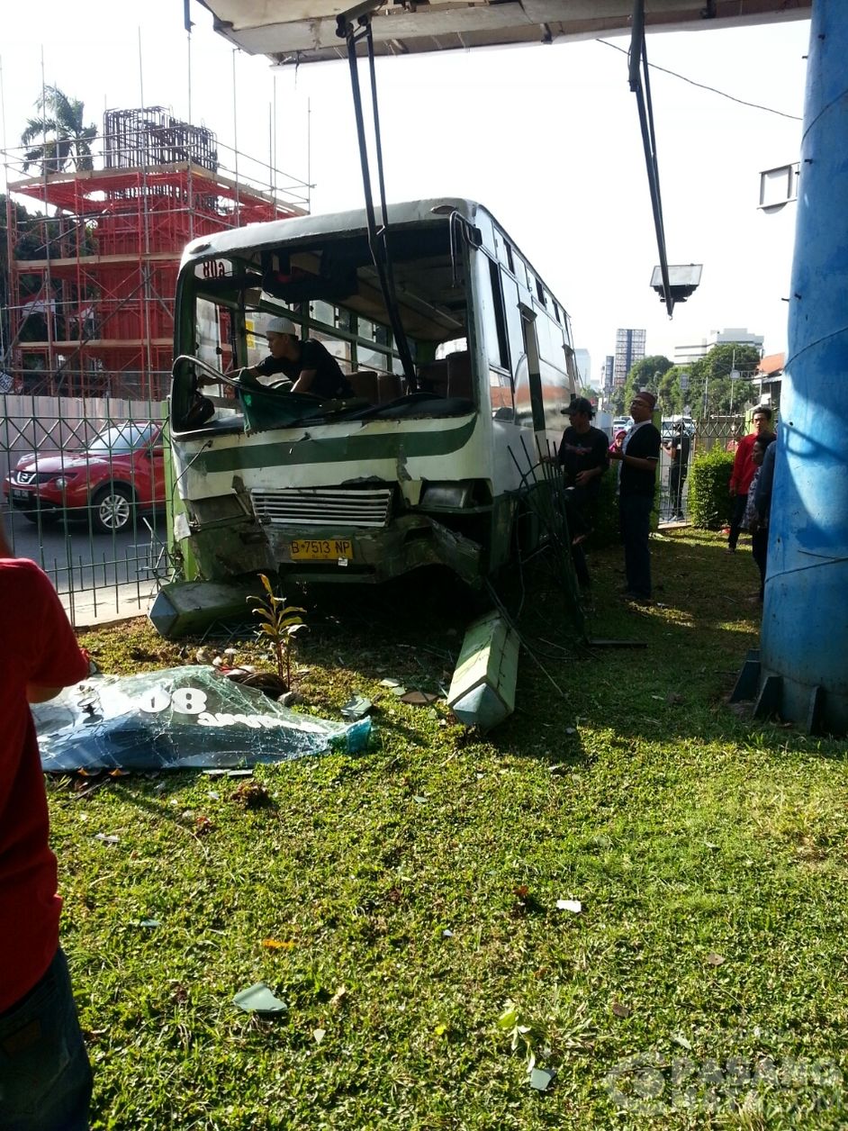 kopaja 608 menabrak taman samping pintu masuk blok m jam 15.29
