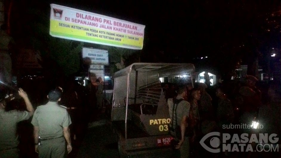 Polisi Pamong Praja, Kota Padang, lakukan giat malam, dengan menertibkan pedagang yang berjualan pada malam hari, di kawasan jalan Khatib Sulaiman kota Padang, Rabu (6/1/2016)