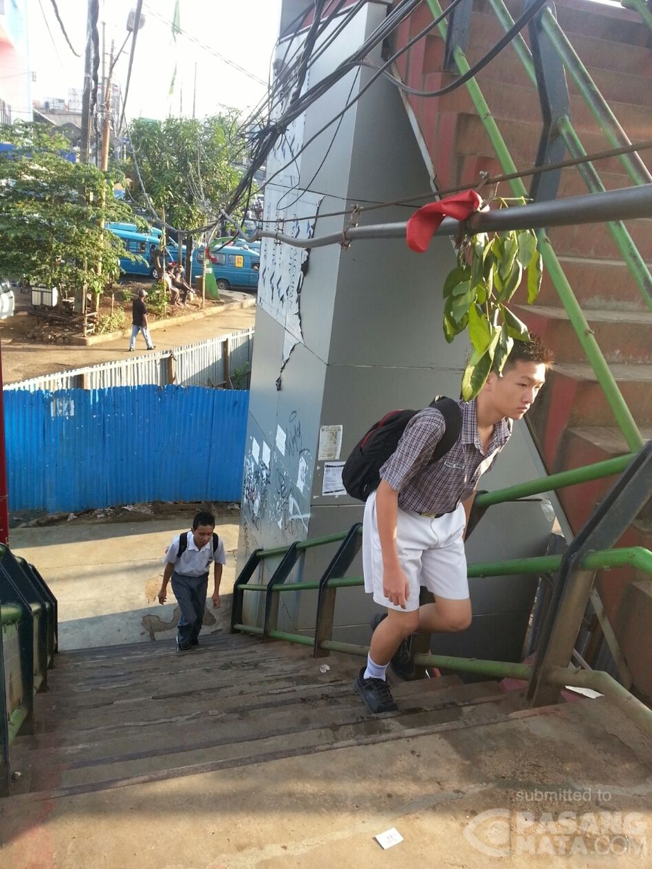 kabel PLN yang melintang di tangga JPO Margonda, Depok, depan terminal Depok, mengganggu pengguna jalan. Warga gunakan daun untuk sekedar memberi tau!