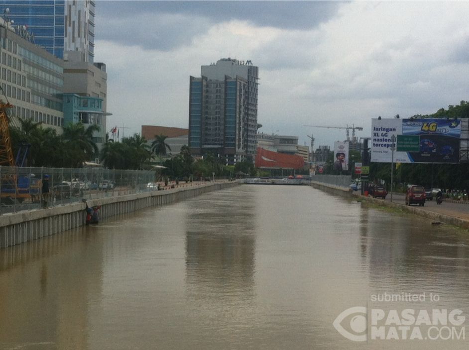 Sejumlah pekerja sedang merapikan pembangunan tanggul Kali Malang samping mal metropolitan kota Bekasi