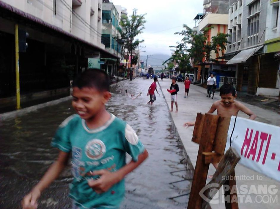 Genangan air akibat proyek rigid beton di Jalan Sibolga Baru, Kota Sibolga menjadi tempat bermain anak-anak karena kendaraan masih enggan melewati jalan ini.