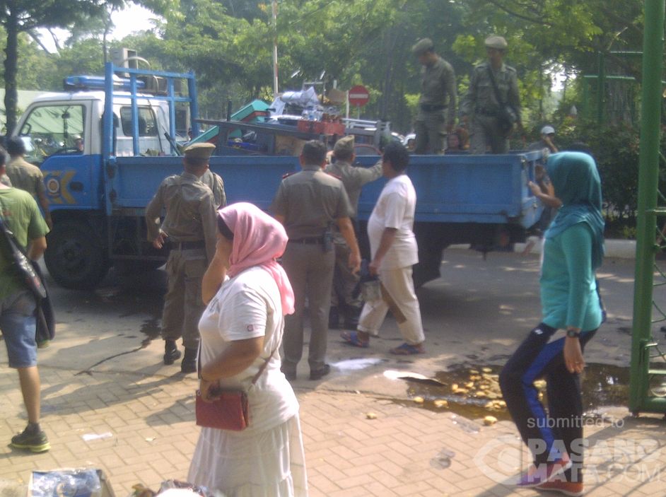 Penindak tegasan petugas satpol PP kpada PKL di taman parkir monas, banyak gerobak yang diangkut.