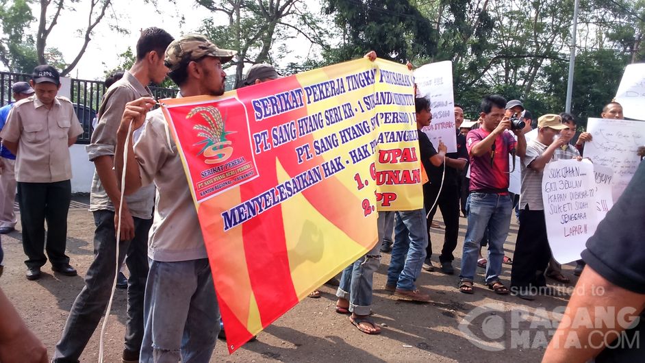 Senin 18 Januari 2016. Unjuk rasa membawa spanduk tuntutan oleh karyawan Sang Hyang Sri Sukamandi di Ciasem, Jawa Barat.