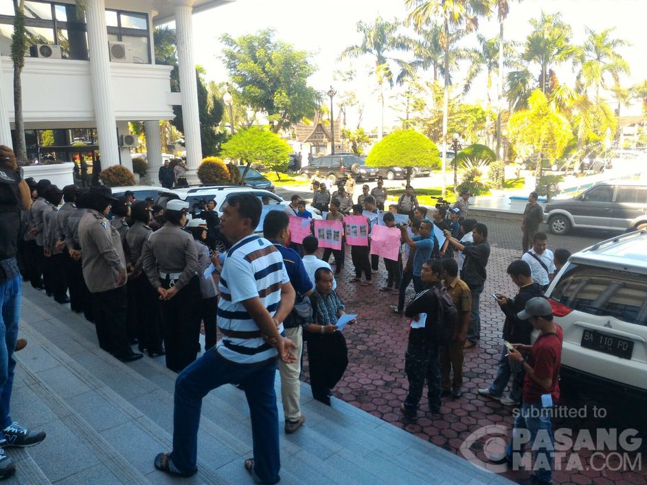Belasan warga berunjukrasa di halaman kantor DPRD Prov.Sumbar, Senin pagi (18/1). Unras didampingi LSM Peduli Lingkungan Bumi Andalas (PELINDAS) mendatangi gedung di jalan Khatib Sulaiman, Padang, mereka menuntut anggota dewan untuk mengusut tuntas tidak selesainya kegiatan pelaksanaan preservasi dan peningkatan kapasitas jalan dan jembatan Nasional Ujung Gading dan sekitarnya oleh PT. Vende Mesti