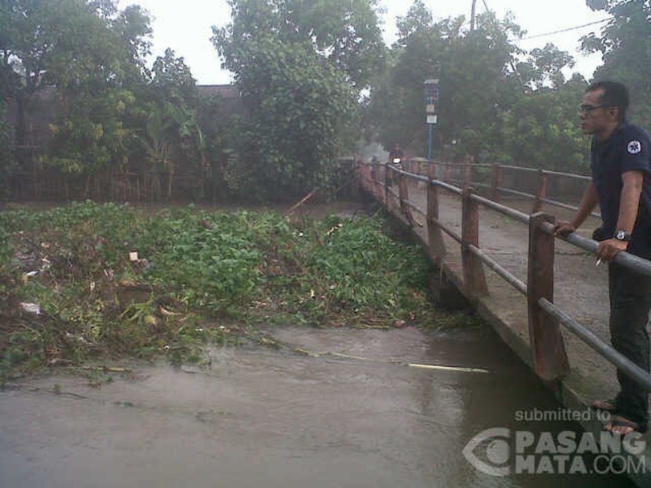 sampah eceng gondok terseret banjir tadi malam membuat air tak lancar sehingga meluap ke rumah warga sekitar sungai sadar di desa gunung gedangan kota mojokerto.