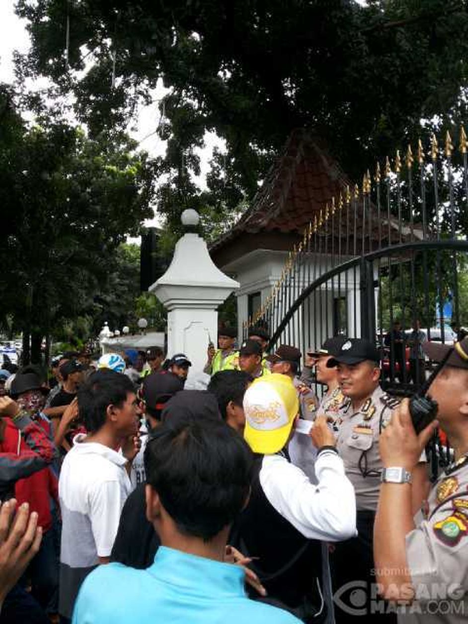 Tampak petugas kepolisian dari Polsek Tanah Abang, Jakarta Pusat. Sedang memantau dan berhadapan langsung dengan para pendemo dari, Elemen KOPI (Koalisi Pemuda Indonesia) di depan gedung Kemenpora, Senayan, Jakarta.