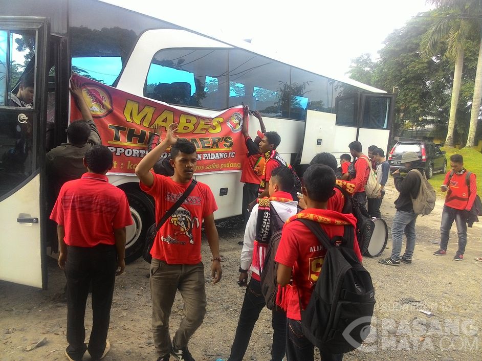 Rombongan pendukung semen padang berangkat menuju GBK menggunakan bus yang difasilitasi oleh Pemko Padang.