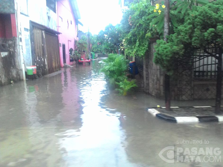 Ada genangan air setinggi kurang lebih 20cm di titik2 tertentu di Perum.Nasio Indah Jatiasih Kota Bekasi pagi ini, Senin 25/01/2016.