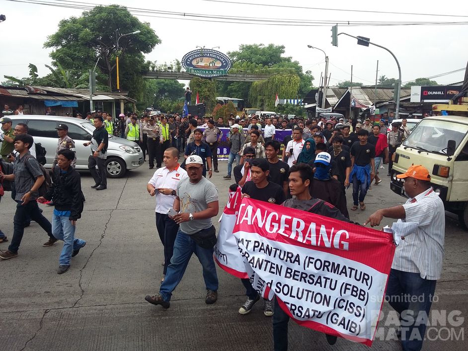 Senin, 25 Januari 2016. Massa berunjuk rasa di M1 Selapajang Jaya Kota Tangerang menuntut Direktur PT Angkasa Pura II mundur dari jabatannya.