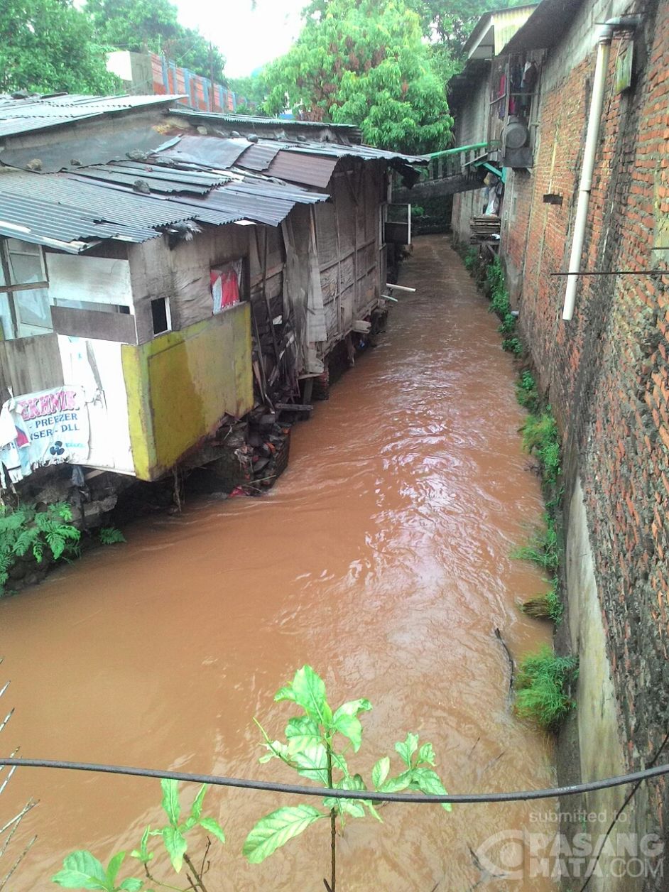 Nampak beberapa bangunan dibibir sungai yang terletak setelah jembatan Perumahan Nasio Indah Jatiasih Kota Bekasi. Disaat hujan tiba cukup lebat, potensi banjir terjadi di Petum.Nasio Jatiasih ini.