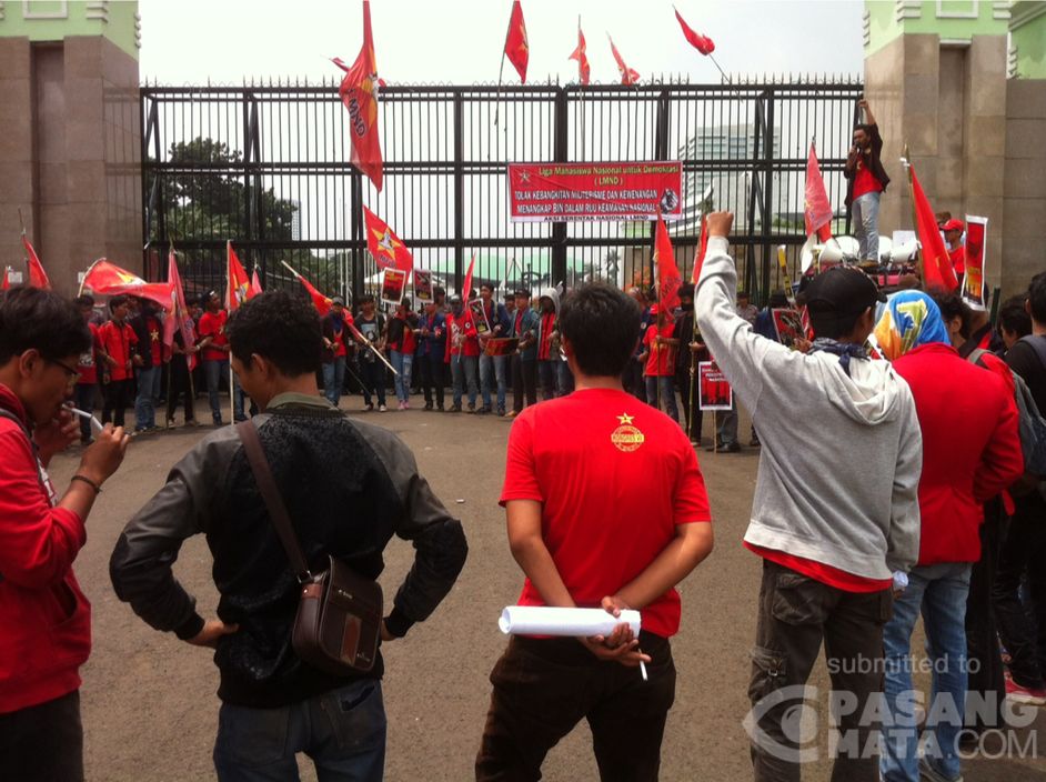 Liga Mahasiswa Nasional untuk Demokrasi unjuk rasa di depan gedung DPR RI Jl Gatot Subroto jakarta, menolak kebangkitan militerisme dan kewenangan menangkap BIN dalam RUU Keamanan Nasional, Kamis 29/1/2016. Selesai demo di DPR RI mereka akan berlanjut ke depan istana negara.