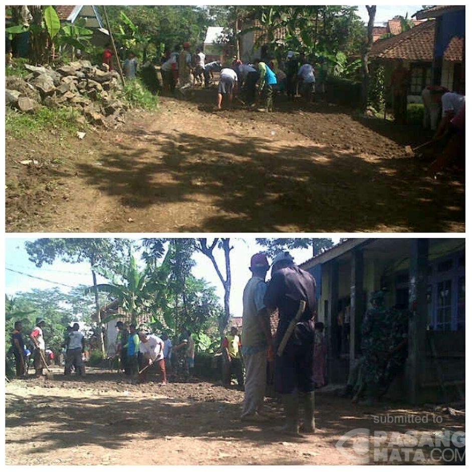 Tampak aksi warga gotong royong bersama memperbaiki jalan yang rusak di desa Peusing Hilir, Sindangkerta, Kabupaten Bandung Barat. [Azhar]