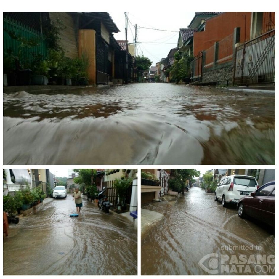 Tampak suasana banjir, imbas hujan deras di Komplek Pemda Blok C9 Jatiasih Bekasi, efek saluran air yang kurang baik dan sangat diperlukan sekali gorong-gorong. [Bonithamrin]