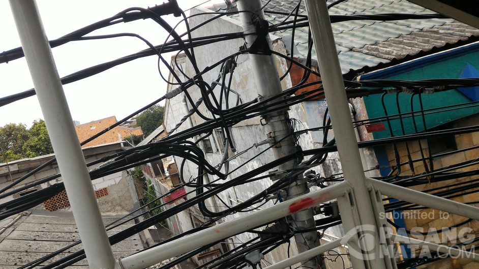 Senin, 1 Februari 2016. serem oi, kabel listrik ini terlalu dekat JPO Jatinegara, Jakarta Timur