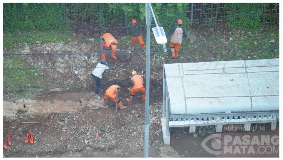 Petugas Siaga Banjir melakukan aksinya membersihkan penyumbat saluran air di TB Simatupang, Pasar Minggu.