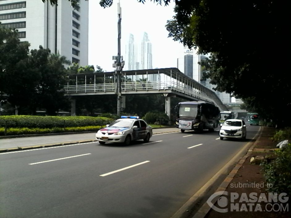 Tampak mulai terlihat rombongan bus yang membawa para pekerja yang hendak melakukan aksi demo, melintas di Jl. Jend. Sudirman, Jakarta, dengan pengawalan aparat kepolisian.