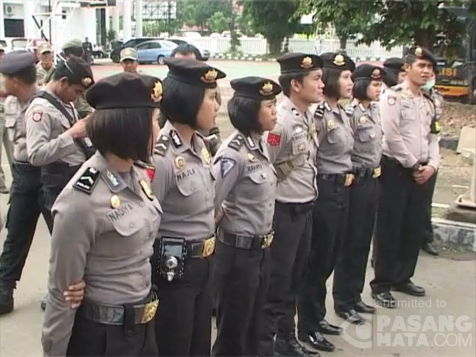 Polwan bersiaga di dalam gerbang pintu gedung rakyat untuk mengamankan aksi unjuk rasa. Polisi yang bersiagapun terpancing dengan ulah massa aksi yang memanjat pagar kantor bupati hingga menimbulkan ketegangan. Lokasi: Karawang, Jawa Barat