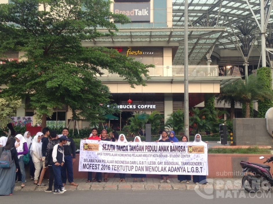 17:30 WIB Berlangsung kegiatan sejuta tanda tangan peduli anak indonesia dari komunitas pelajar di bekasi (Student Center) dengan tema Selamatkan Pelajar Indonesia Dari LGBT di depan Grand Galaxy Park, Bekasi Selatan.