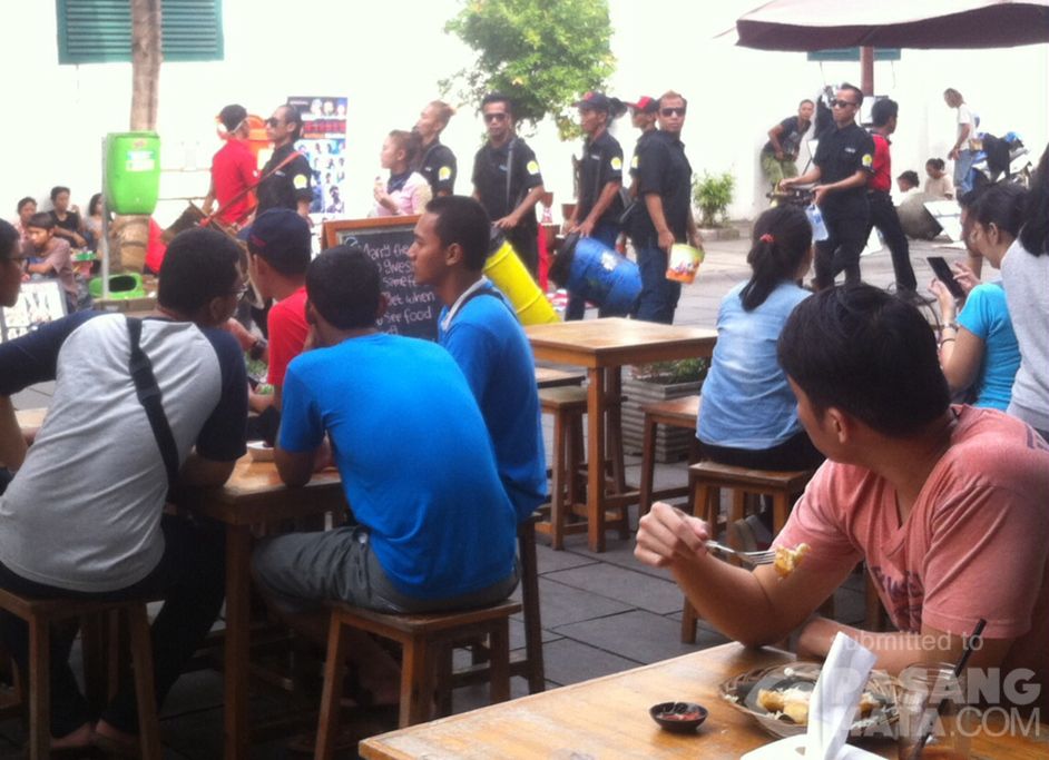 Menjelang sore ini, berbagai atraksi musisi jalanan mulai menghibur pengunjung Kota Tua.