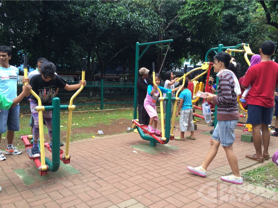 Ramainya pengunjung yang secara bergantian mencoba sarana kebugaran yang terpasang di depan Gelora Bung Karno, senayan (21/02).