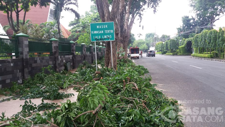 Sore ini petugas DKP kota Surabaya melakukan pemotongan cabang dan ranting pohon di Jl. Kapuas Surabaya, agar tak terjadi pohon tumbang di musim hujan.