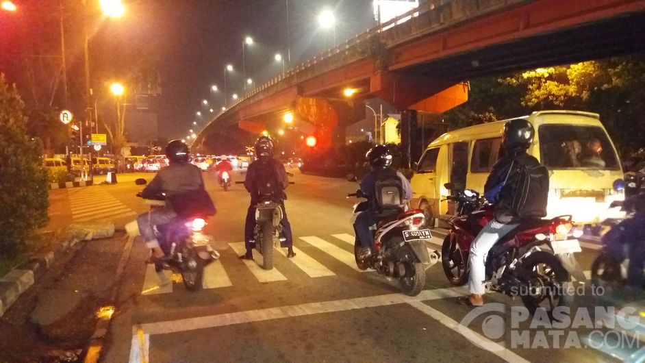 Para pengendara ini tak menghiraukan batas berhenti saat lampu merah di Jalan Raya Wonokromo Surabaya.