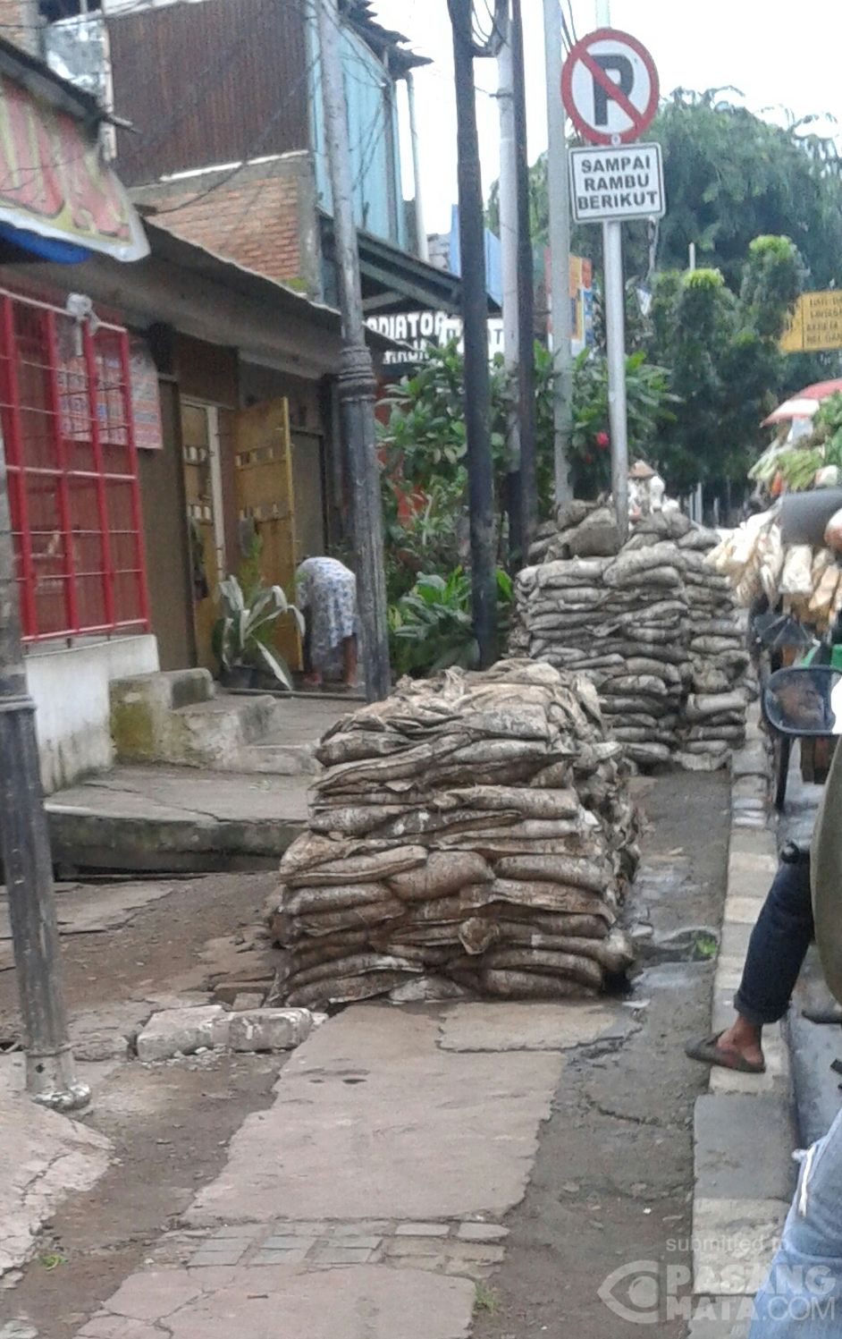 Duh banyak karung penuh lumpur di trotoar Jl Pramuka