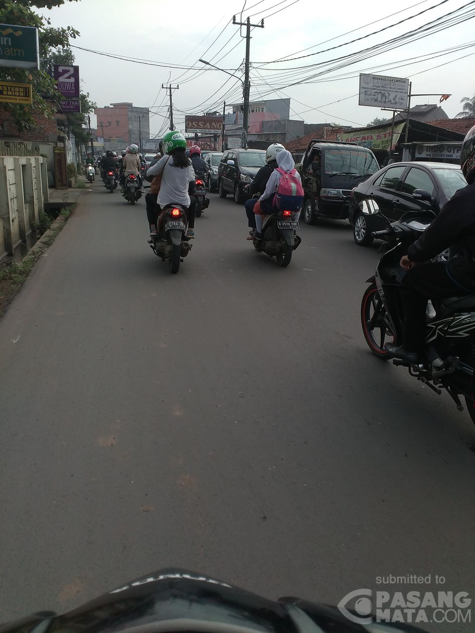 Lalin di Cirendeu Raya terlihat macet mengarah ke Pondok Cabe, dan lengang di arah sebaliknya.