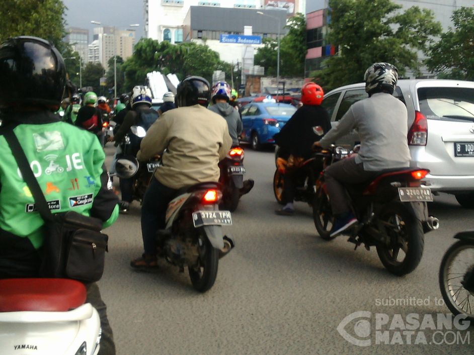Kelakuan pengendara bila berada di lampu merah. Maju ke depan lewati batas garis agar bisa jalan duluan. Padahal sangat membahayakan. Lokasi lampu merah Kalibata - Pasar Minggu.