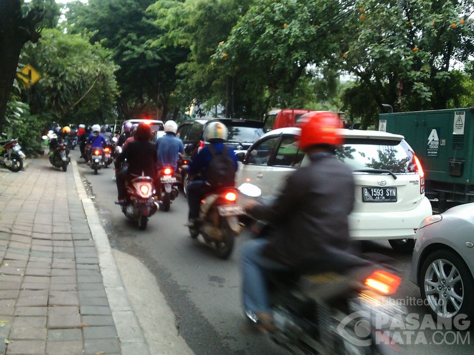Kelakuan pengendara bila berada di lampu merah. Maju ke depan lewati batas garis agar bisa jalan duluan. Padahal sangat membahayakan. Lokasi lampu merah Kalibata - Pasar Minggu.