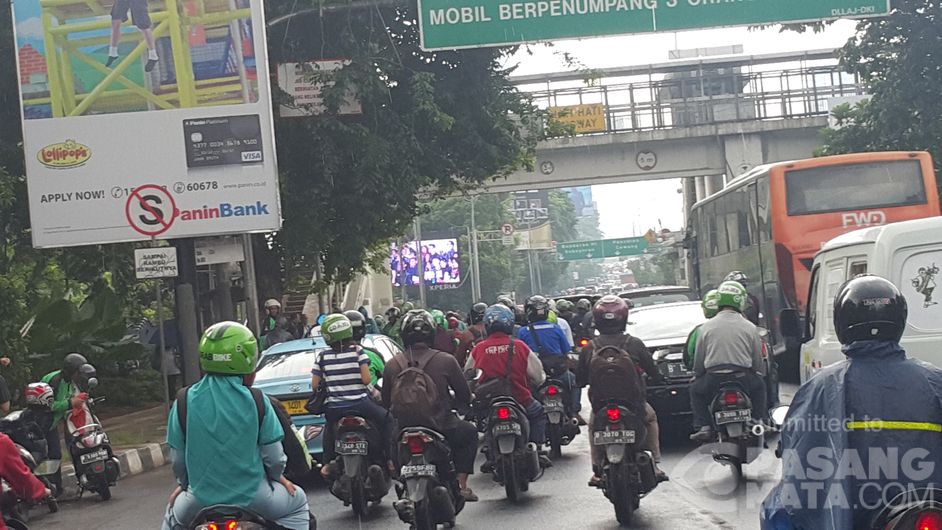 Rabu 24.02.2016 Jam 09.15. Hujan rintik-rintik yg membasahi bumi Jakarta Selatan membuat arus lalu lintas melambat merayap di Jl. Tol Cawang menuju Jembatan Semanggi. Harap waspadai para pemotor yg berteduh di pinggir jalan di bawah JPO.