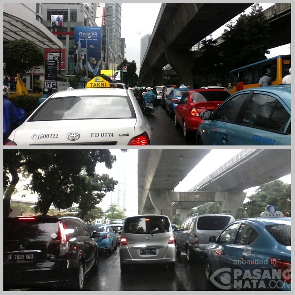 Saat ini arus lain kedua arah di Jl. Prof Dr. Satrio, terpantau ramai dan cuaca masih tampak mendung.
