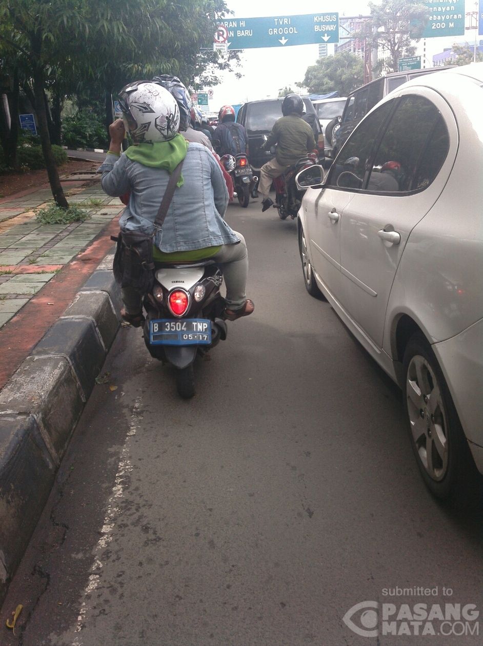 Kecelakaan mobil pribadi tabrak separator busway samping Gerbang Tol Semanggi (setelah Halte Semanggi) arah kuningan, macetnya dari Halte Gerbang Pemuda (JCC).