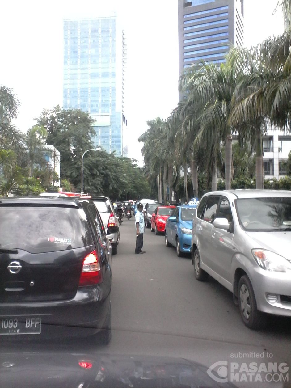 Kamis, 25 Februari 2016. Tampak saat ini, ramai lalin di Jl. Denpasar Raya, Kuningan, Jakarta. Mengakibatkan beberapa kendaraan yang terpaksa harus putar balik karena antrean yang cukup panjang. Imbas padatnya arus lalin di Jl. Satrio.