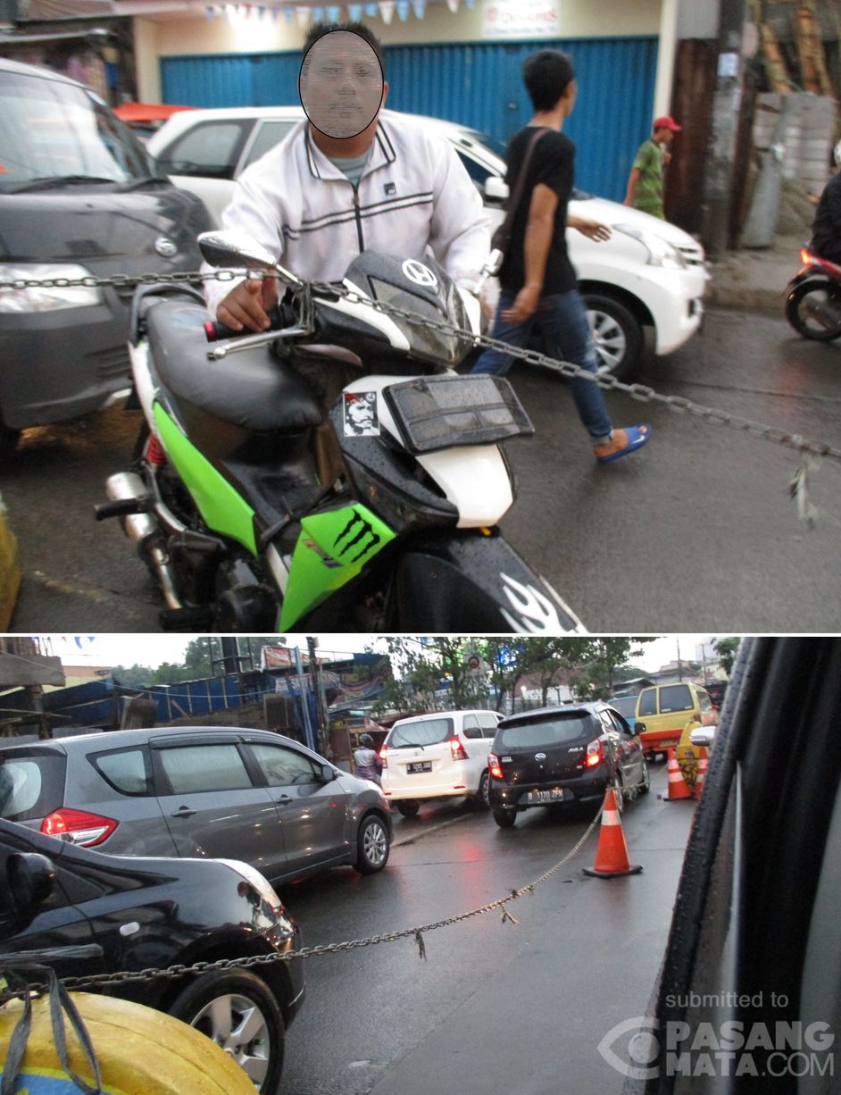 Putaran di depan Carrefour Jl. Dewi Sartika ditutup, karena padatnya arus lalu lintas, tapi masih ada saja pengendara yang bandel menerobos rantai pengikat. @250216