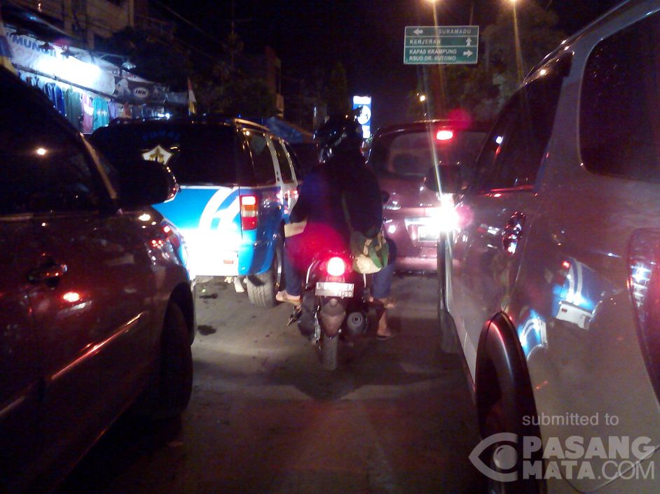 Kamis, 25 Februari 2016 jam 19:00 WIB arus lalu lintas dari Kapasan arah Suramadu Surabaya macet total
