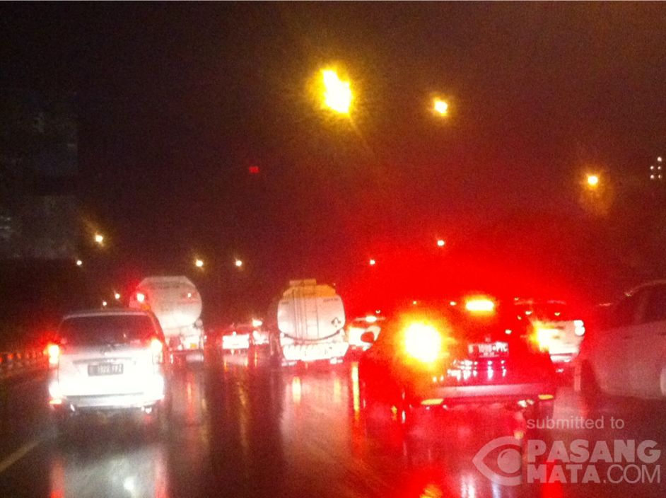 Tol dalam kota arah cikampek padat jelang cawang, cuaca masih hujan