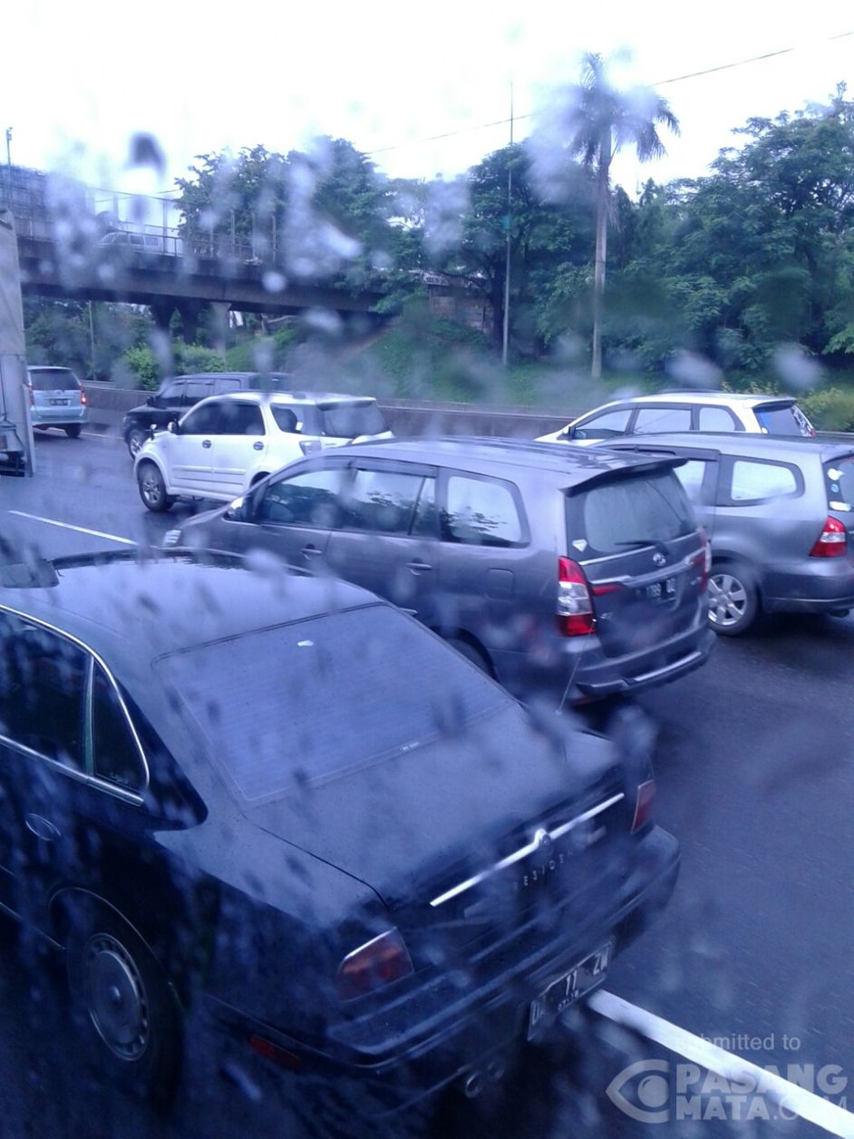 Jumat, 26 Februari 2016. Arus lalu lintas di Tol Cikampek arah Jakarta sejak km 8 terpantau padat merayap.