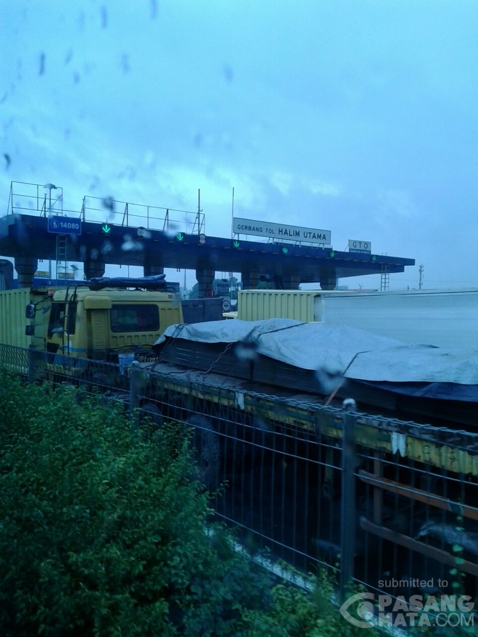 arus lalu lintas di depan gerbang tol halim utama terpantau padat. exit cawang juga padat. cuaca mendung