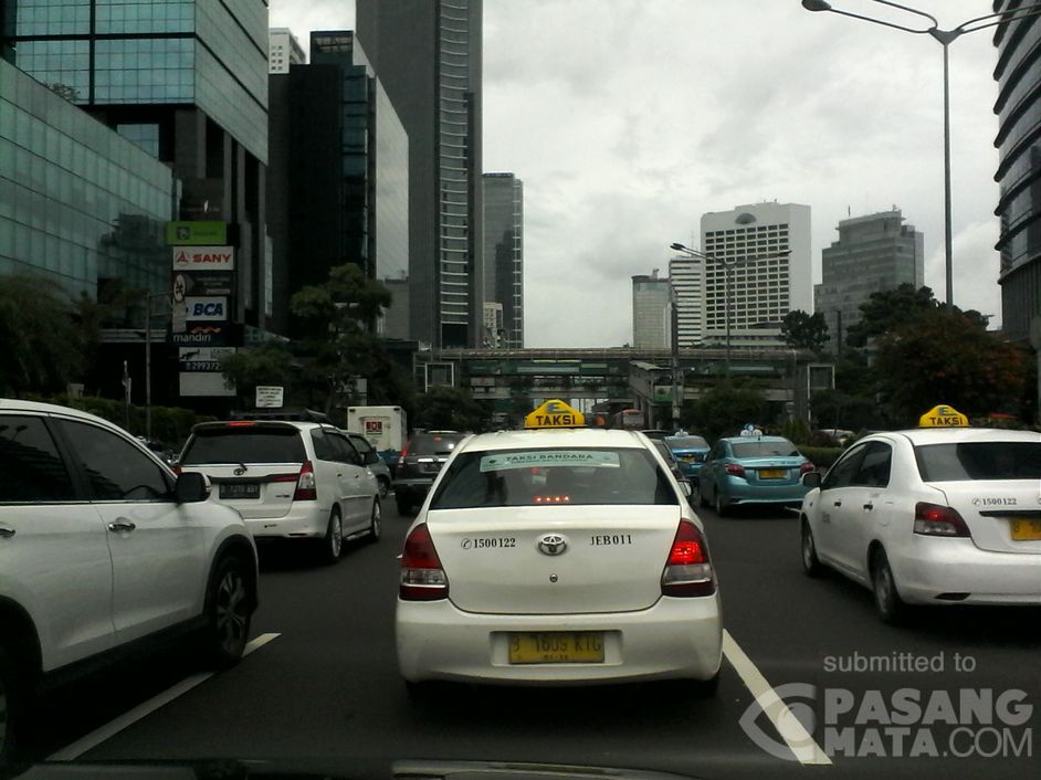 Tampak arus lalu lintas yang ramai saat ini di Jl. Jenderal Sudirman, sekitar halte Tosari, mengarah bundaran Hotel Indonesia