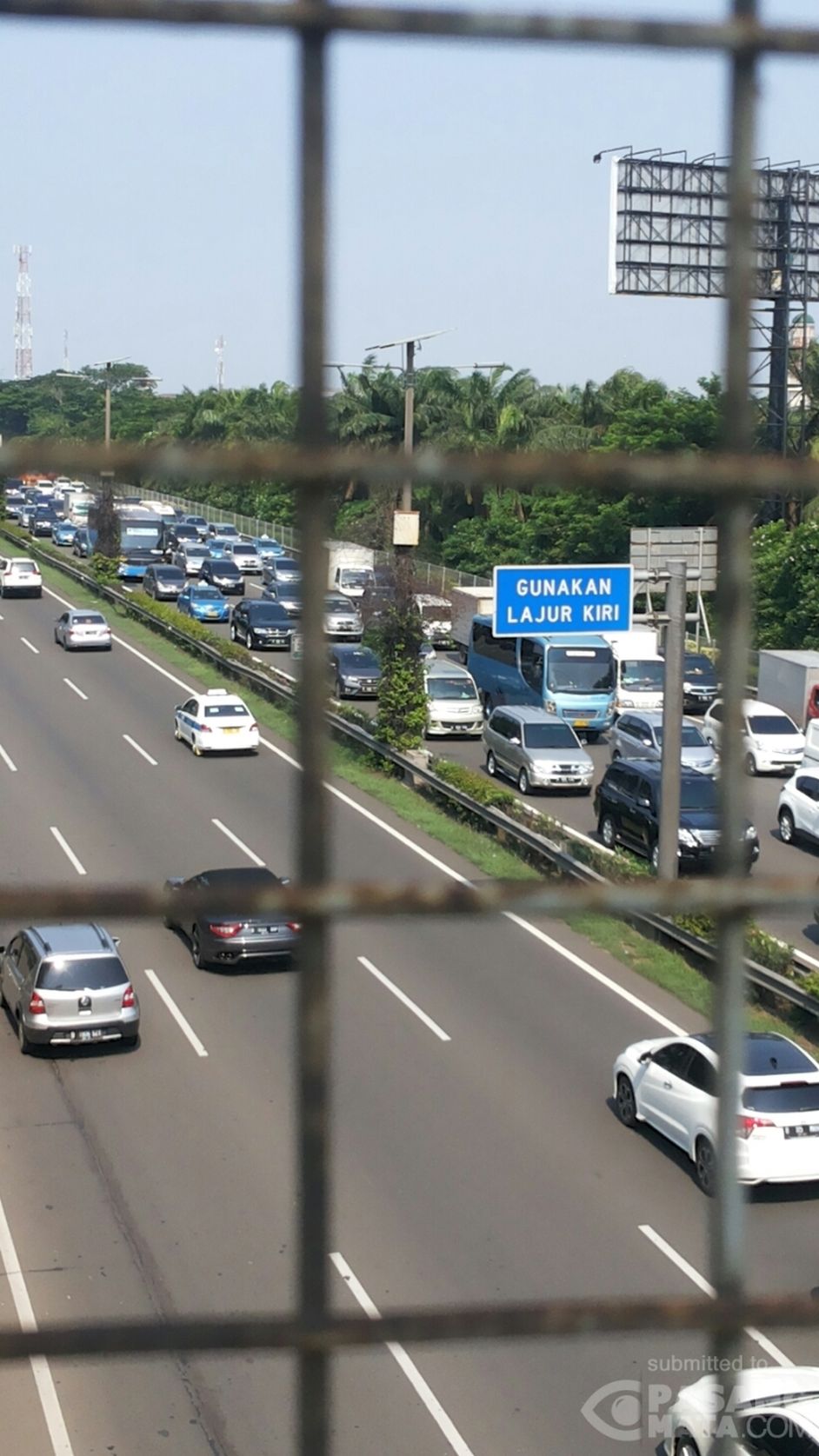 Jalan tol Cengkareng arah Bandara Soekarno Hatta antrean panjang.