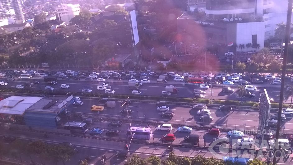 Jalan Gatot Subroto arah Semanggi hampir tidak bergerak petang ini padahal tol Dalam Kota arah yang sama ramai lancar. Tol Dalkot dan jl Gatot Subroto arah Kuningan juga ramai lancar menjelang waktu pulang kantor.