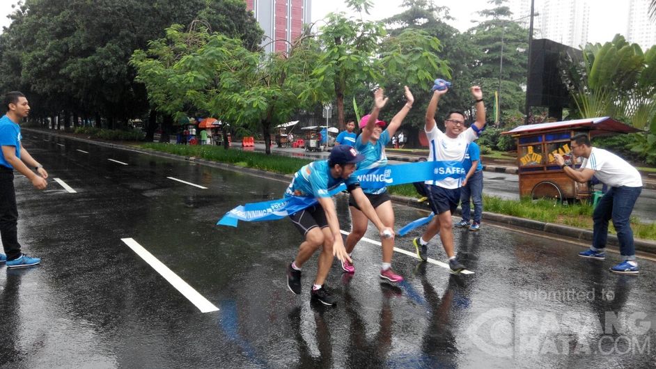 09.00 WIB Hujan tidak menghalangi peserta lomba lari di jalan Sudirman, Jakarta.