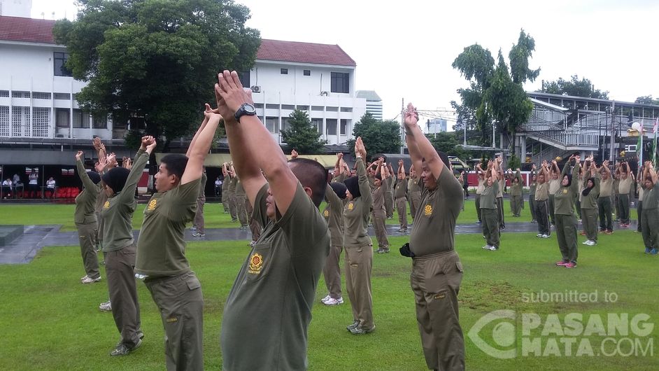 Diguyur hujan rintik rintik prajurit dan PNS Kostrad senam aerobik di Markas Kostrad, Gambir Jakarta Pusat, Selasa 1 Maret 2016