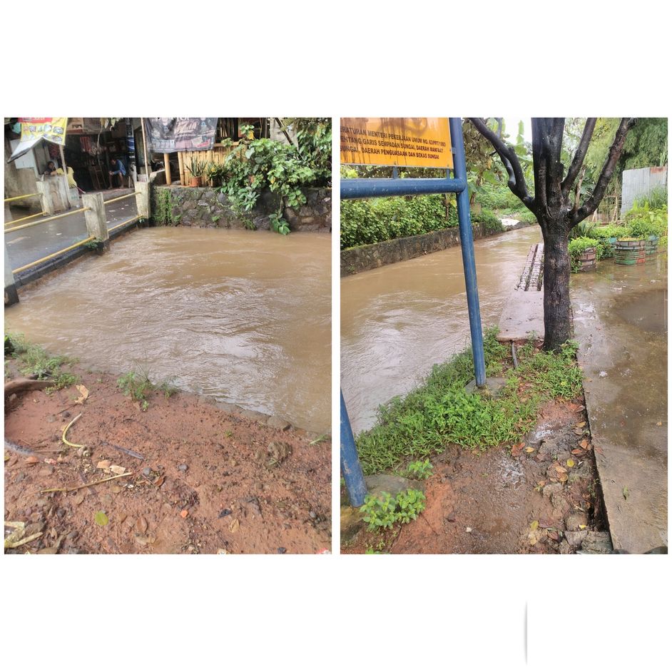 Hujan malam tadi membuat debit air kali di perumahan Pondok Hijau Ciputat terlihat meluap dan hampir sama dengan tanggul jalan.
