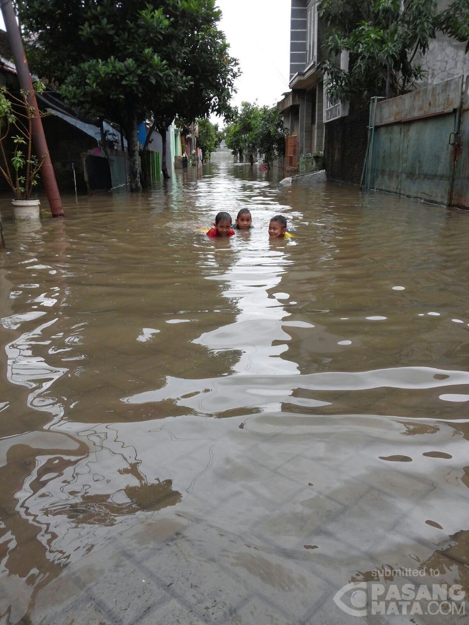 Anak-anak memanfaatkan banjir untuk bermain air. Lokasi Perum Total Persada Tangerang.
