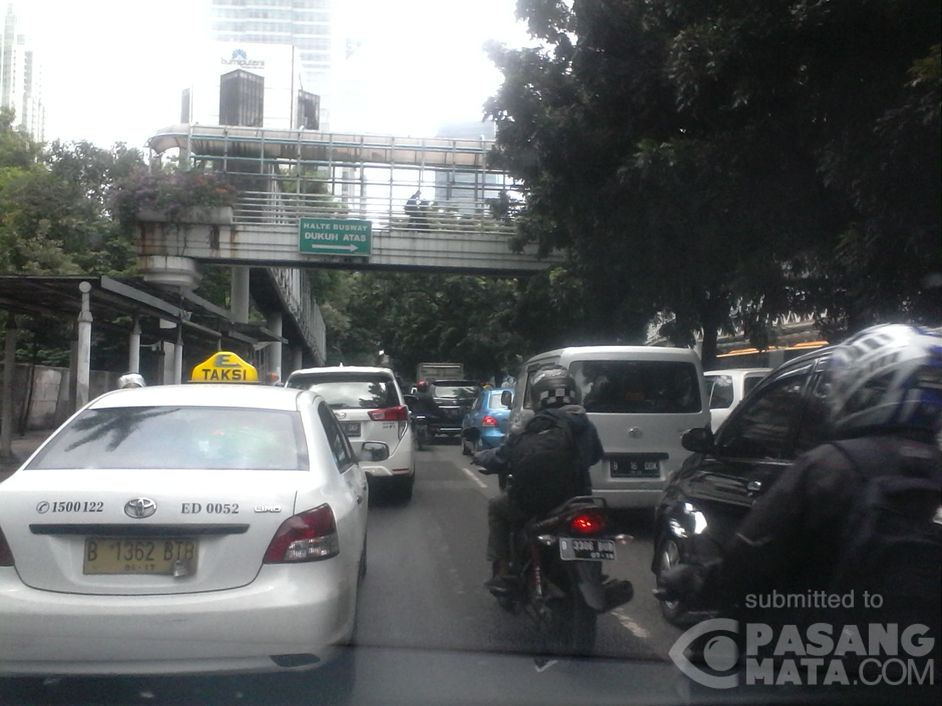 Tampak arus lalu lintas yang sangat padat saat ini di sekitar halte Dukuh Atas arah Karet dan Semanggi.