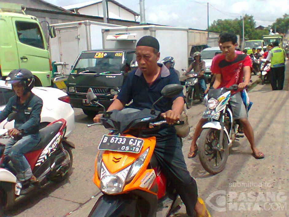 Jalan Kapuk Kamal terpantau padat di kedua arah, cuaca cerah.