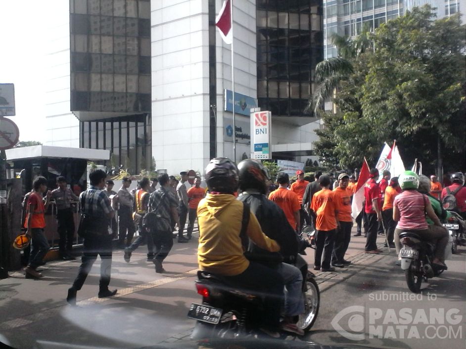 Tampak pagi ini sedang berlangsung aksi unjuk rasa di depan gerbang gedung Bumiputera. Sehingga arus lalin tersendat di sekitar jalur lambat Jl. Jend. Sudirman, arah Setiabudi, Karet dan Semanggi.